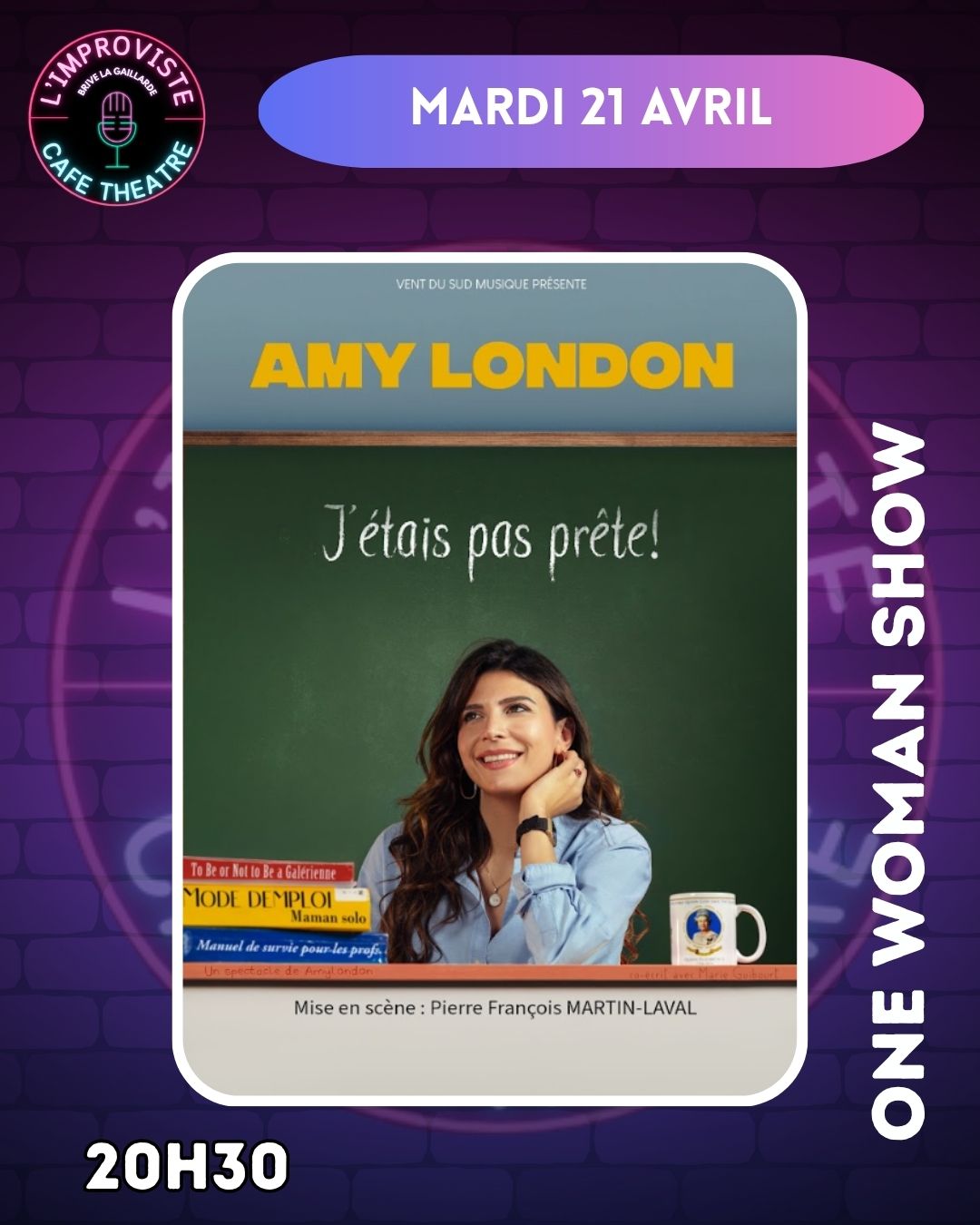 « J’étais pas prête », c’est l’histoire d’une prof qui voulait changer le monde, mais qui a fini par changer de vie. D’une salle de classe à la scène, Amy London raconte son grand écart entre l’Éducation nationale, une délivrance inattendue, un envol vers l’inconnu et le labyrinthe des rencontres modernes.