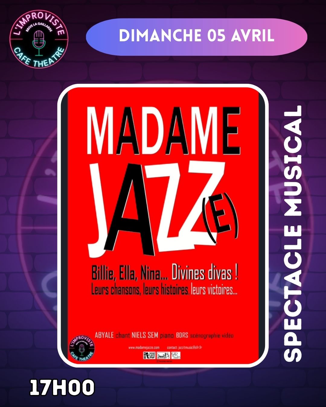 Lady Day, Nina Simone, Aretha Franklin, Tina Turner, Joséphine Baker… Indomptables chanteuses de jazz ! Des vies déchirées, des enfances cabossées, mais toujours une furieuse envie de vivre, de chanter, de danser! Leurs chansons iconiques, des anecdotes étonnantes, un duo de choc au chant et au piano, une scénographie vidéo qui nous rappelle les visages de ces femmes puissantes… Bienvenue chez Madame Jazze !
